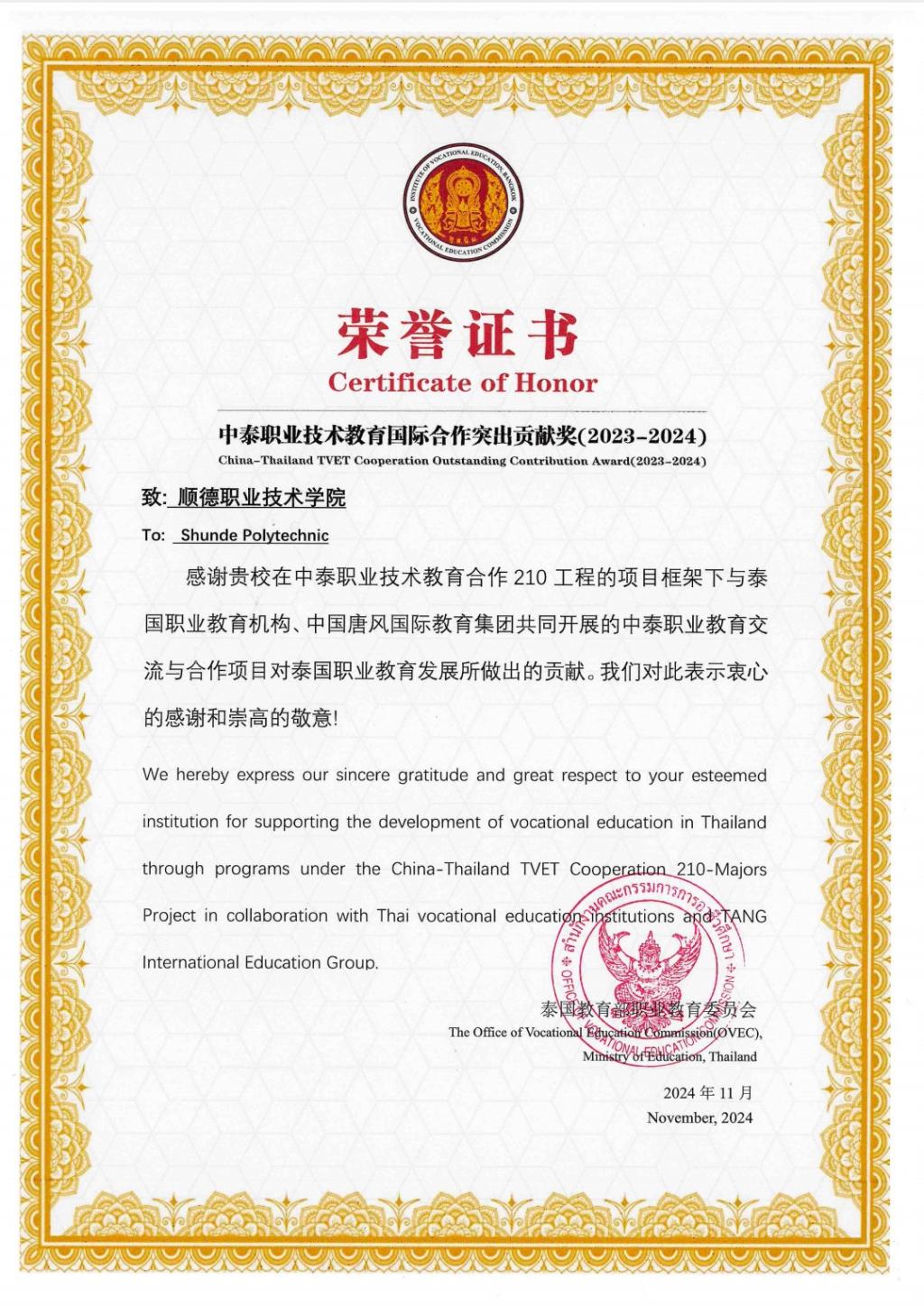 11月8日,中泰职业技术教育合作“210工程”第四次大会在泰国曼谷隆重召开。贝博官网获泰国教育部授予的“中泰职业技术教育国际合作突出贡献奖”。